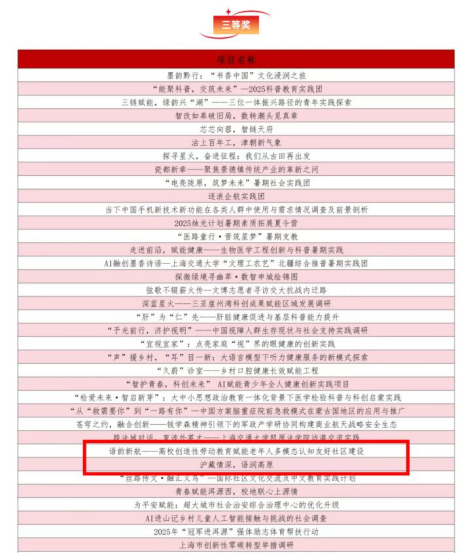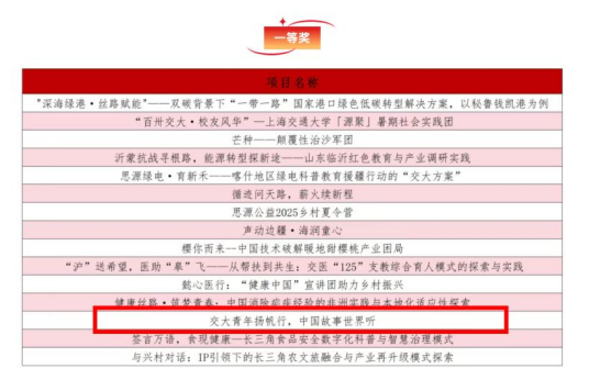 近日,上海交通大学2025年学生暑期社会实践优秀项目评选结果公布。在学院党委领导、学院团委指导下,外国语学院共有三支实践团队从全校数百支实践团队中脱颖而出。“交大青年扬帆行,中国故事世界听”实践团获“一等奖”,“语韵新航--高校创造性劳动教育赋能老年人多模态认知友好社区建设”实践团及“沪藏情深,语润高原”实践团获“三等奖”。
