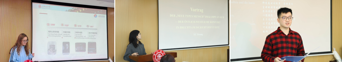 随后,德语系研究生代表先后进行汇报。赵佳璐介绍了上海交通大学外国语学院及德语系的发展历程与学术特色,回顾了自南洋公学以来的演进脉络与国际合作项目,重点展示外院在跨学科、跨文化领域的创新成果;俞懿容结合本科与研究生阶段的学习经历,分享了德语学习的体会,并阐述了她对中德文学与文化亲缘关系的研究兴趣;何佳浩则以布莱希特诗歌《题一个中国茶树根雕》为例,从个人研究出发,分析了德语文学对中国文化元素的借鉴与融合,指出布莱希特对中国文化的高度认同及其在社会批判与审美构建中的运用。薛松在总结中指出,卫礼贤的中国典籍德译对德国文学影响深远,李白、白居易等诗人也在德国广受关注。她强调,歌德学院与孔子学院持续为两国文教交流搭建桥梁,而中德之间的文化交流互鉴必将进一步推动彼此的理解与合作。