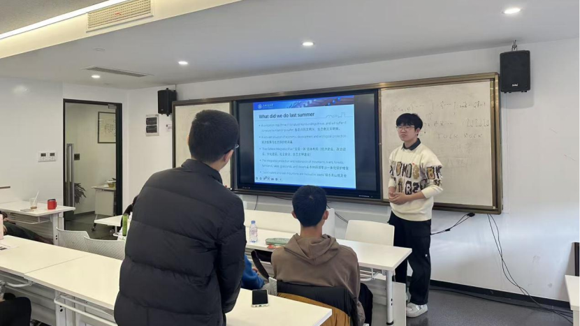 活动现场,外国语学院本科生联合党支部成员围绕中国式现代化展开双语专题分享。孔莘瑶以“筑基工业宏图,创新赋能新篇”为题,系统阐释了马克思主义工业化理论在中国的创新发展,通过中国航海博物馆等案例,用生动易懂的语言向同学们阐释了中国工业化道路的独特优势与成就。
