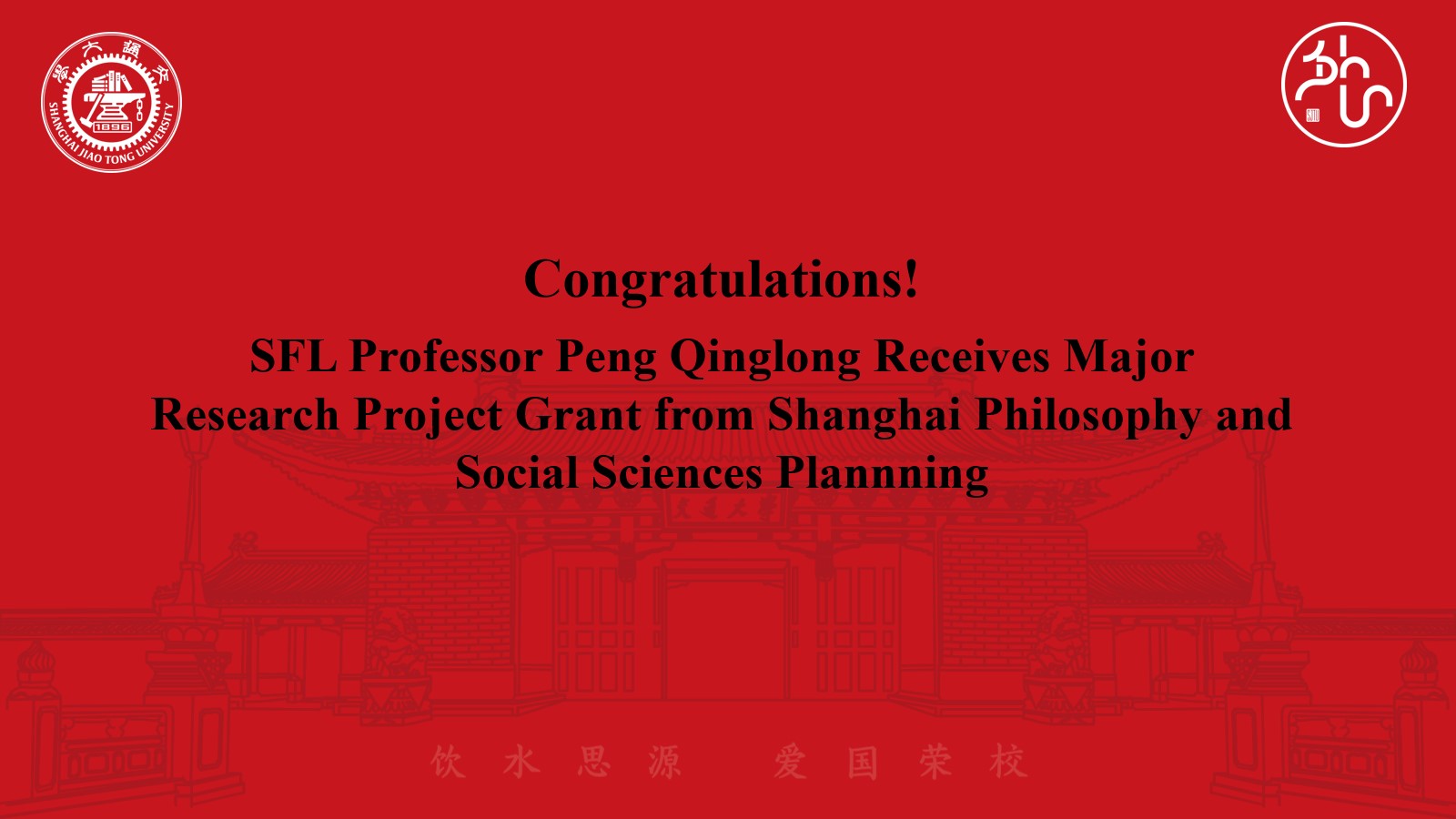 The project "Research on the Construction of an Autonomous Knowledge System of Regional and Country Studies in China" led by Professor Peng Qinglong from the School of Foreign Languages at Shanghai Jiao Tong University has been approved as a major research project of the Shanghai Philosophy and Social Sciences Planning, according to the Shanghai Social Sciences Planning Office.