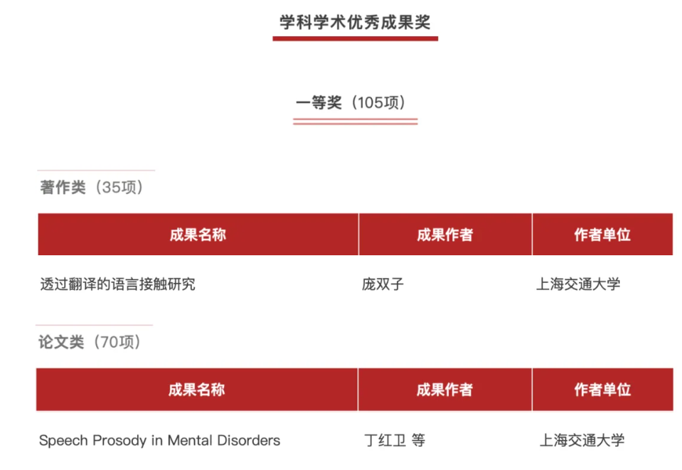 Recently, the list of the winners of the 17th Shanghai Philosophy and Social Sciences Outstanding Achievement Award was announced. Five SFL teachers made the list. Among them, Professor Pang Shuangzi's book "A Study of Language Contact through Translation" won the first prize in the category of monographs of the "Academic Excellence Award in Philosophy and Social Sciences". Professor Ding Hongwei's paper "Speech Prosody in Mental Disorders" won the first prize in the category of papers of the "Academic Excellence Award in Philosophy and Social Sciences". Professor Shang Biwu's book "A Study on McEwan's Fiction Creation and Its Ethical Value" and Professor Li Jincai's book "The Referential Mechanism of Proper Names: Cross-cultural Investigations into Referential Intuitions" respectively won the second prize in the category of monographs of the "Academic Excellence Award in Philosophy and Social Sciences". Professor Li Luan's paper "CCLOWW: A grade-level Chinese children’s lexicon of written words" won the second prize in the category of papers of the "Academic Excellence Award in Philosophy and Social Sciences".