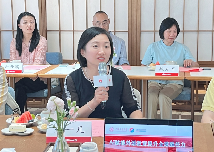 朱一凡介绍了外国语学院的发展情况。她从学院的历史沿革、党建工作、学科建设、人才培养方案改革等方面展开阐述,详细介绍了AI赋能外语教育提升全球胜任力的具体做法,着重强调了学院在培养具有国际视野、跨文化沟通能力的复合型外语人才方面的特色与优势。并表示,交大外院与华为翻译中心是长期的合作伙伴,已成功举办五届“思源华为杯”创译大赛,期待未来能拓展与华为合作的新空间,共同培养国家和社会需要的新时代人才。