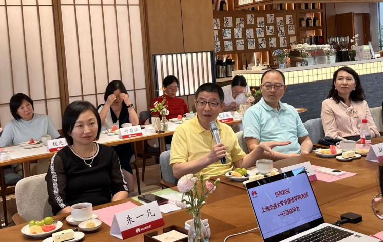 为深化校企合作,探索校企协同新路径,促进人才培养与企业需求精准对接,10 月11日,上海交通大学外国语学院党委书记朱一凡带队前往华为上海研发中心开展交流合作,学院副院长陶庆、党委副书记张怡凡,党委委员,第二教工党支部书记赵勇,院长助理金晶,第一教工党支部书记、本科生公共英语教学中心主任江妍及第一、二、七教工党支部党员代表参加此次活动。活动由华为上海政企教育客户经理徐维蔓主持,双方围绕学院发展、企业文化、人才培养及校企合作等议题深入探讨。